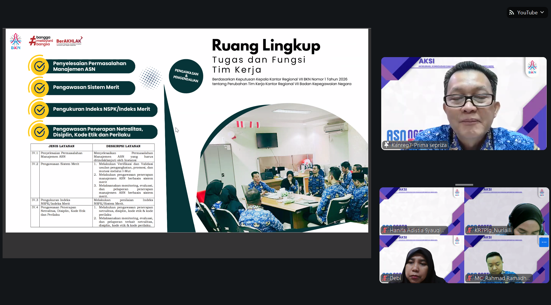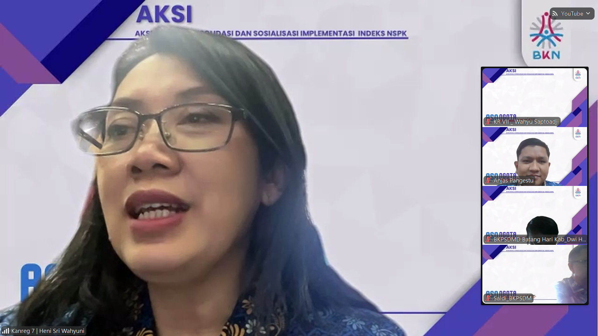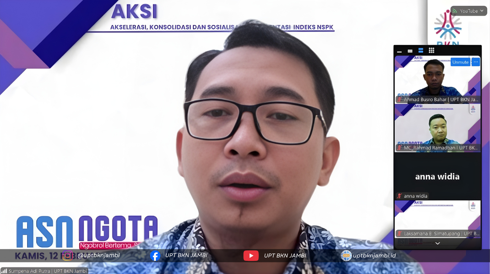 Jambi (12/02/2026) - UPT BKN Jambi menyelenggarakan webinar bertajuk "ASN NGOBROL BERTEMA (NGOTA) SERIES 1 : Akselerasi, Konsolidasi, dan Sosialisasi Indeks (AKSI) NSPK Manajemen ASN" pada Kamis (12/02) pukul 09.00 WIB hingga selesai. Kegiatan ini dilaksanakan secara daring melalui Zoom Metting dan disiarkan langsung melalui YouTube.