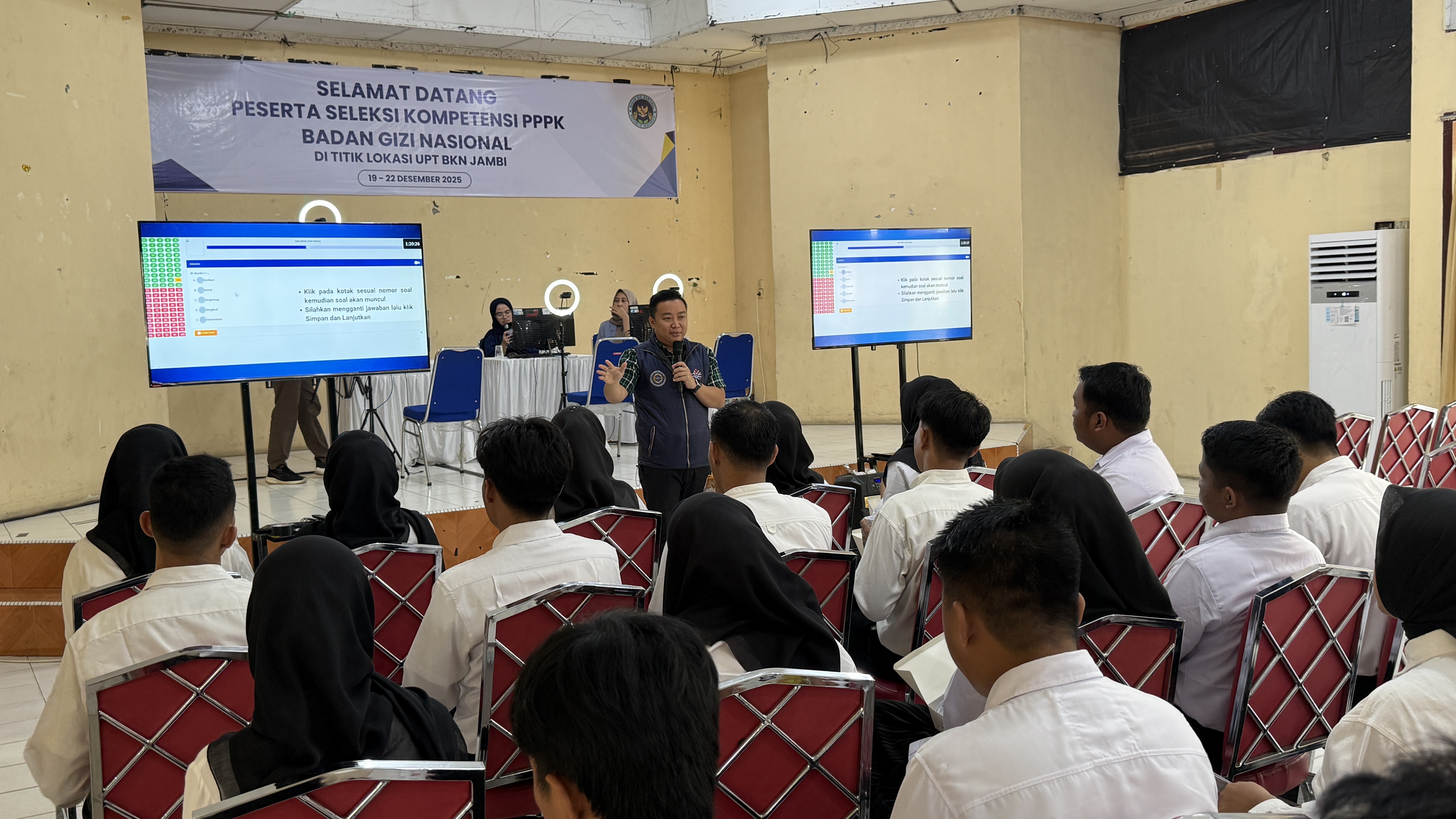 Jambi - Sebagai bagian dari tugas dan fungsi di bawah wilayah kerja Kantor Regional VII BKN Palembang, UPT BKN Jambi selaku titik lokasi telah melaksanakan Seleksi Kompetensi PPPK Tahap II tingkat instansi Badan Gizi Nasional T.A. 2025 pada tanggal 19 - 22 Desember 2025.