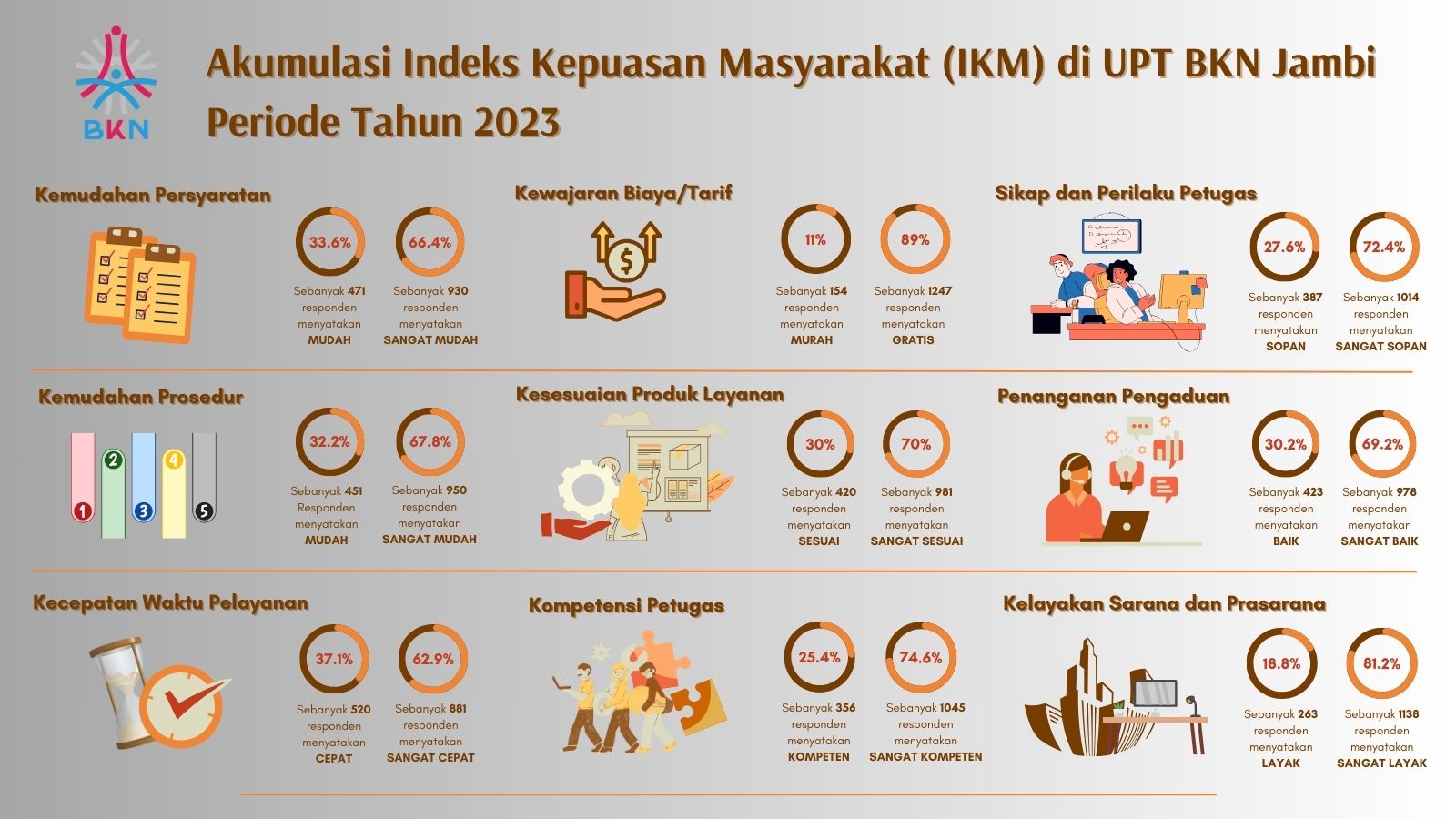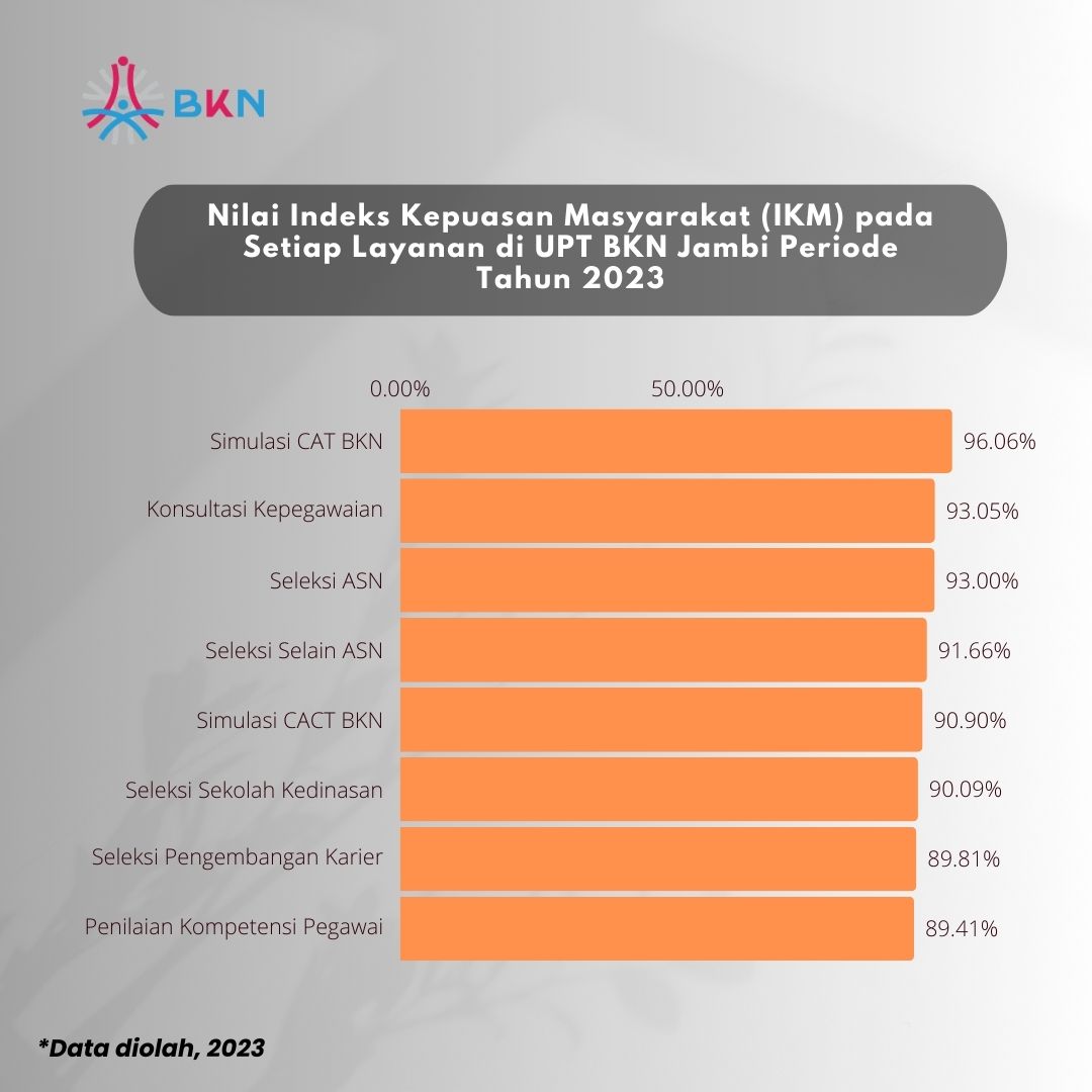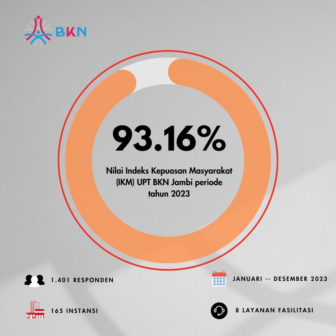 Pada penghujung tahun 2023, UPT BKN Jambi mampu merampungkan pengukuran tingkat kepuasan masyarakat yang difasilitasi selama satu periode tahun 2023. Tingkat kepuasan masyarakat diukur melalui delapan (8) jenis layanan yang disediakan di UPT BKN Jambi, yaitu Konsultasi Kepegawaian, Seleksi Pengembangan Karier, Seleksi ASN, Seleksi Sekolah Kedinasan, Seleksi Selain ASN, Penilaian Potensi dan Kompetensi Pegawai ASN, Simulasi CAT BKN, dan Simulasi CACT BKN. Indeks Kepuasan Masyarakat (IKM) di UPT BKN Jambi secara akumulasi melebihi target untuk periode tahun 2023, yaitu sebesar 93,16%. Untuk IKM pada setiap layanan yang difasilitasi juga menunjukkan hasil positif yang mencapai target di atas 89%.